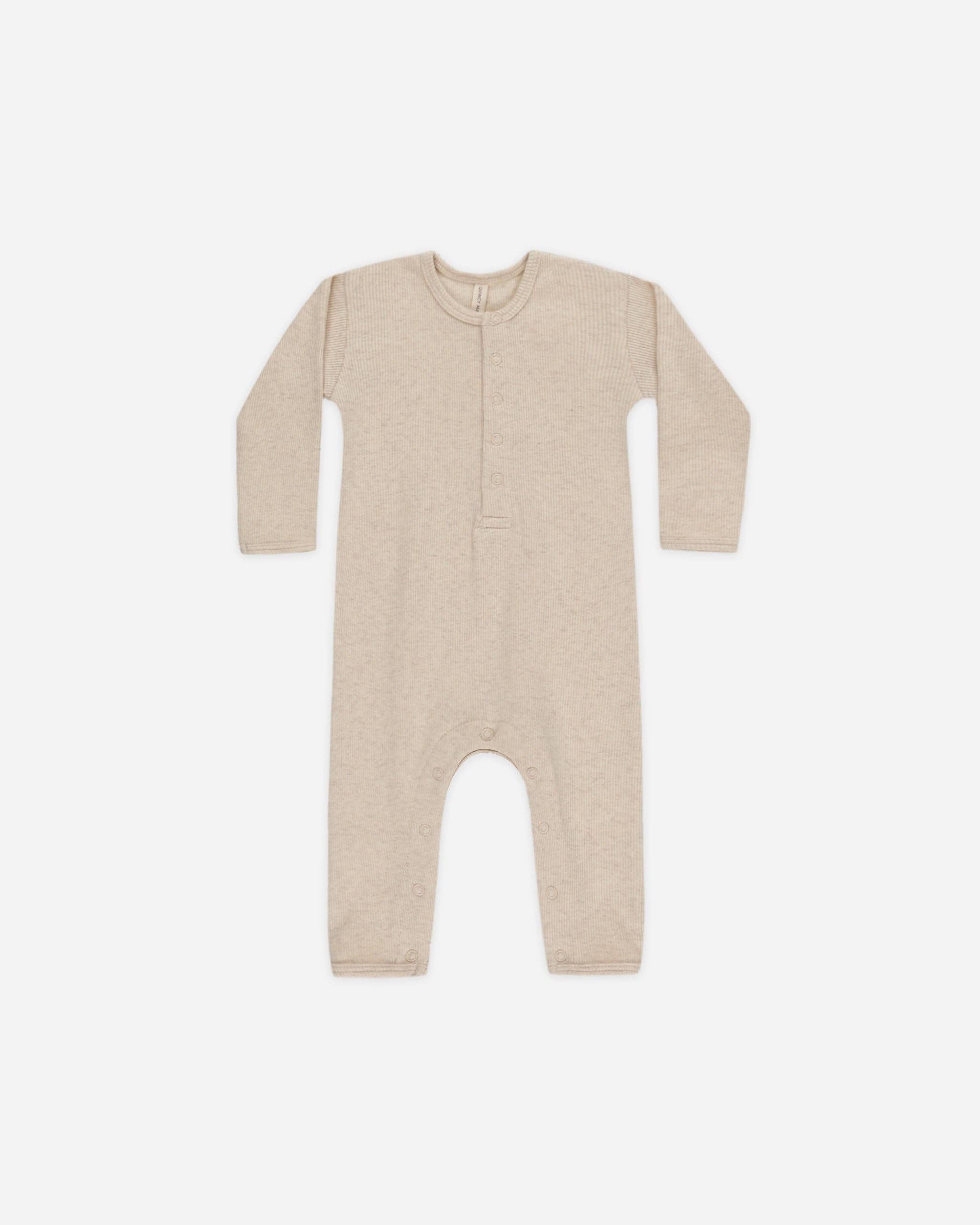 Long sleeve baby jumpsuit in our stretchy ribbed melange knit, designed with snaps along the front and inseam for easy, comfortable wear.