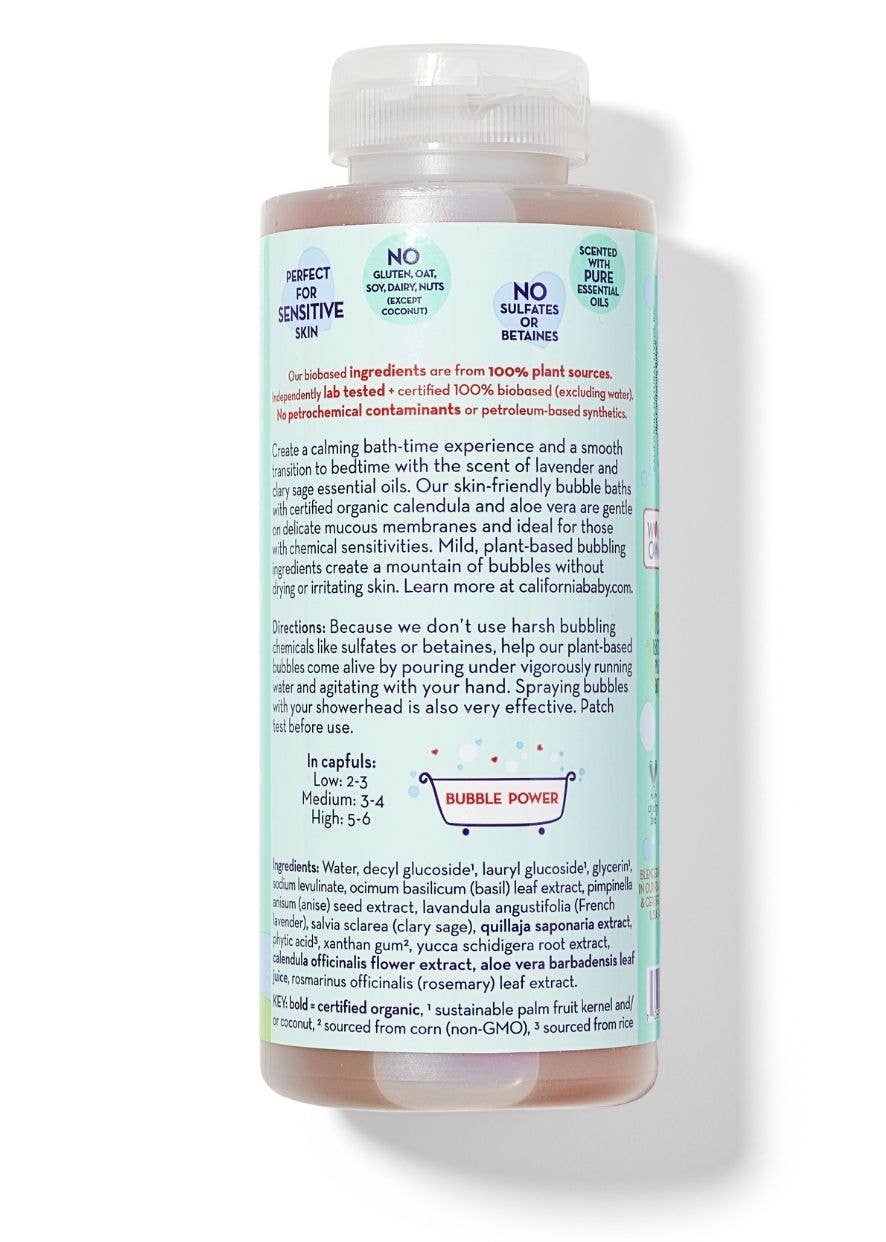 French lavender & clary sage essential oils combine for a light, calming scent—perfect before bedtime. Our famously gentle, skin friendly bubble baths are ideal for those with sensitive skin, eczema, and allergy concerns. Unlike the harsh chemicals found in many common bubble baths, our gentle formulas are made with plant-based bubbling ingredients that still create a mountain of bubbles without drying or irritating sensitive skin or eczema. Meanwhile, certified organic aloe vera and calendula extract further soothe the skin. Our irresistible scents are made from 100% pure essential oils and zero of the unknown and unlisted chemicals found in synthetic fragrance. Bubble wand included! This new Bubble Bath formula features our exclusive, 100% plant-based preservative system that we created after 6 years of research and development. This first-of-its-kind preservative system includes isolates of basil and anise (not essential oils) and is exclusive to California Baby products! Learn more here.