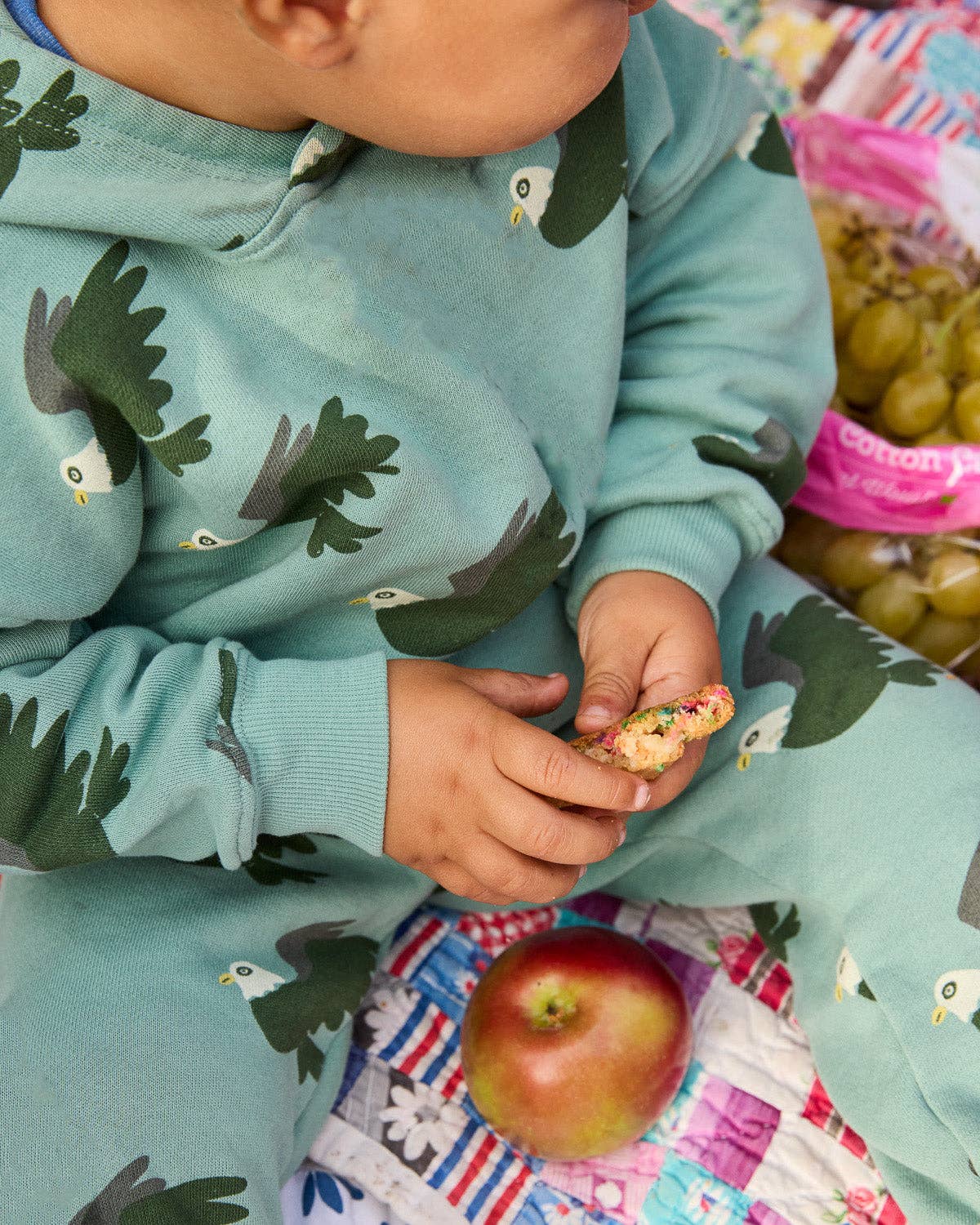 100% organic cotton These sweats are sized to shrink in the wash. This season we added extra inches to our sizing, so you can wash them any way you want (though we still recommend drying on low). So choose your child's correct size, and if it seems big, it won't stay that way!