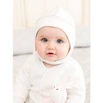 This organic brushed sherpa ear flap hat is a must-have for the chilly season! Keeps your baby's head and ears nice and warm with snaps under the chin for extra security and snug fit.