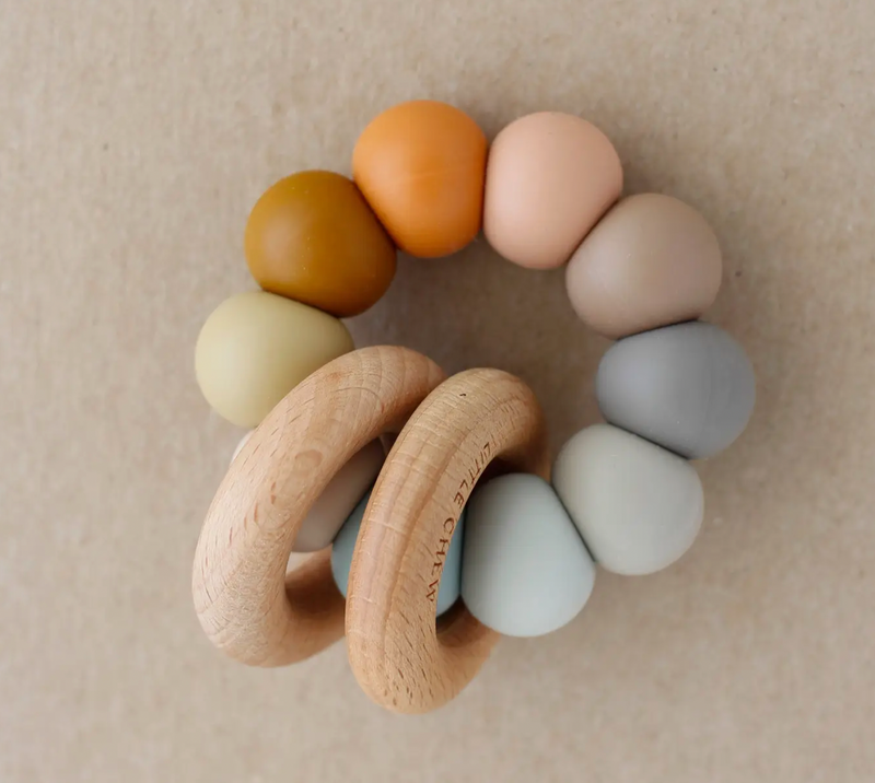 A mix of soft silicone and beechwood that have been treated with beeswax. This teether was designed with safety in mind witch will helps to soothe and comfort the baby's tender gums. The simple design is easy for small hands to grab, hold and explore! We recommend treating wood with beeswax or coconut oil for smoothness and longer-lasting!